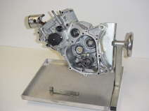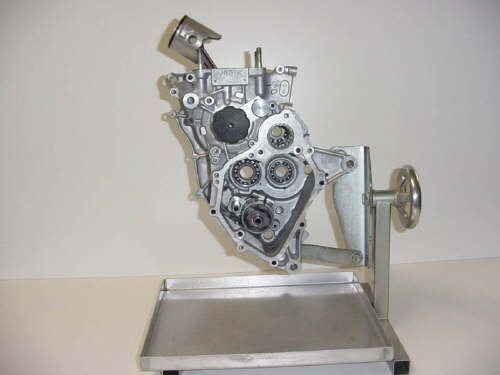 Engine holder for easy repair measurements. Rotates horizontally and locks into place.